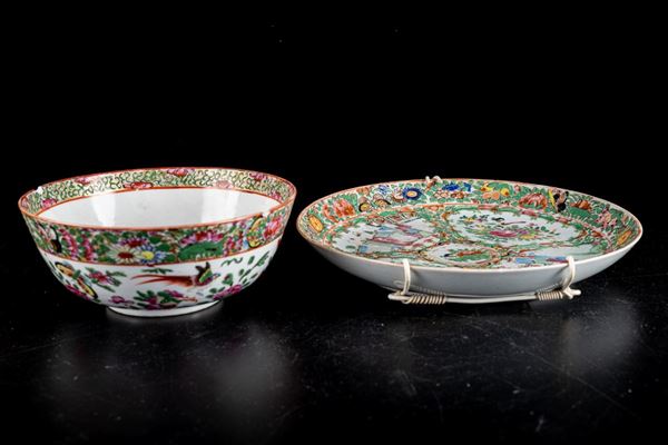 and a single plate, in white porcelain with floral decoration. Bowl dimensions: 17.5 x 7 cm; plate size: 24 cm diameter.