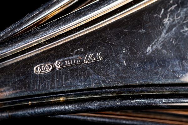 consisting of 12 large forks, 12 soup spoons, 12 small forks, 12 teaspoons, 3 serving cutlery (a ladle, a spoon and a fork), 2 bone and silver salad cutlery, 12 large knives, 12 dessert knives . Net weight: 2808 gr; Gross weight: 2208 gr; Total weight: 5016 gr.