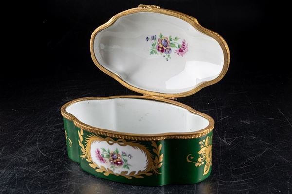 In polychrome porcelain in an elliptical shape, with a green background with floral decorations within gilded reserves on a white background. Bronze cranksets and pure gold finishes.
