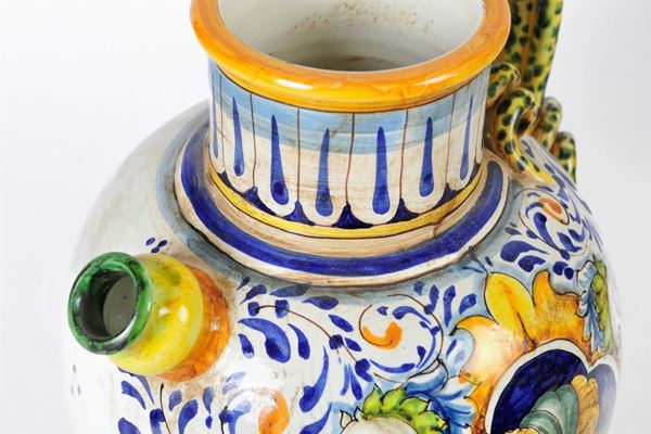 In ceramic, globular body with ring base, narrow and high neck with lid. Snake handle, with mask. Nozzle pourer. Floral decoration on a white background and profiles of characters within polylobed blue reserves.