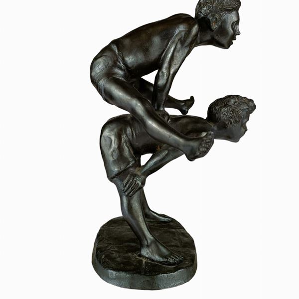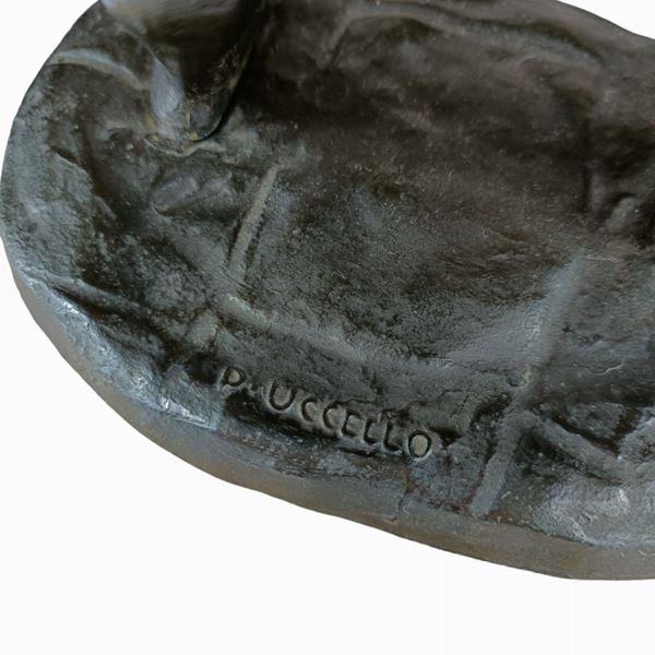 Scultura in volume, in antimonio, a patina bruna, su base in marmo crema. Firmato P. Uccello sulla base