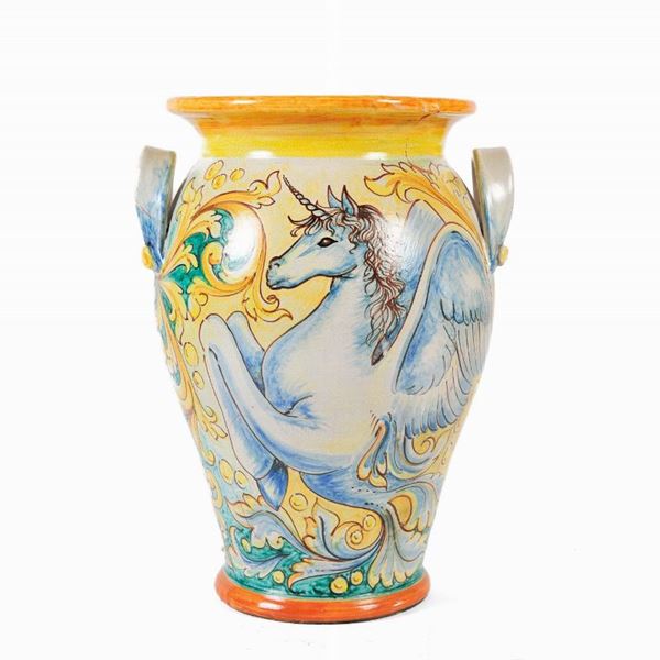 Baluster body, short neck with flared hem and ring foot. Two ribbon handles, with unicorn decoration on a yellow and blue background. Signed Antonio Dolce. With locked felting.