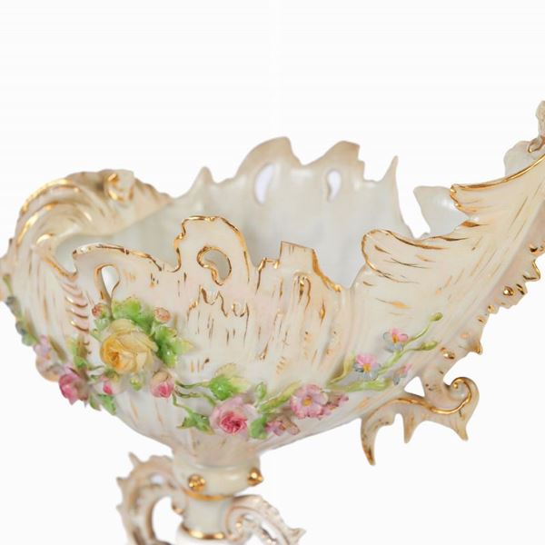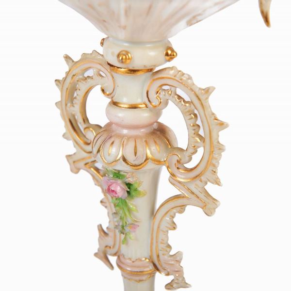 in polychrome porcelain, with floral relief decoration and pure gold finishes. Stem-shaped stem with double curly handle, circular stem, shell-shaped body. Very small shortcomings.