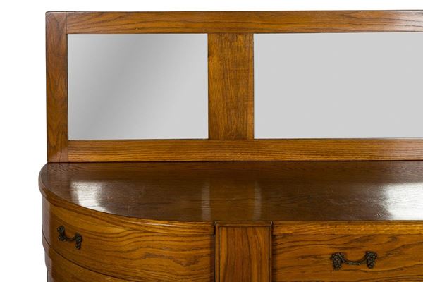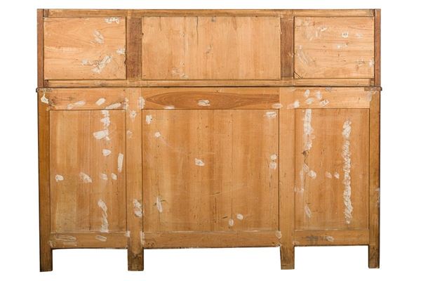 dal profilo curvo, a quattro sportelli e tre cassetti, alzata completa di vetri, applicazioni in bronzo