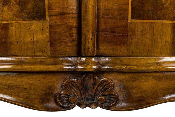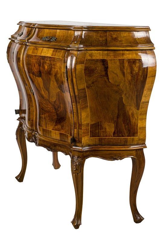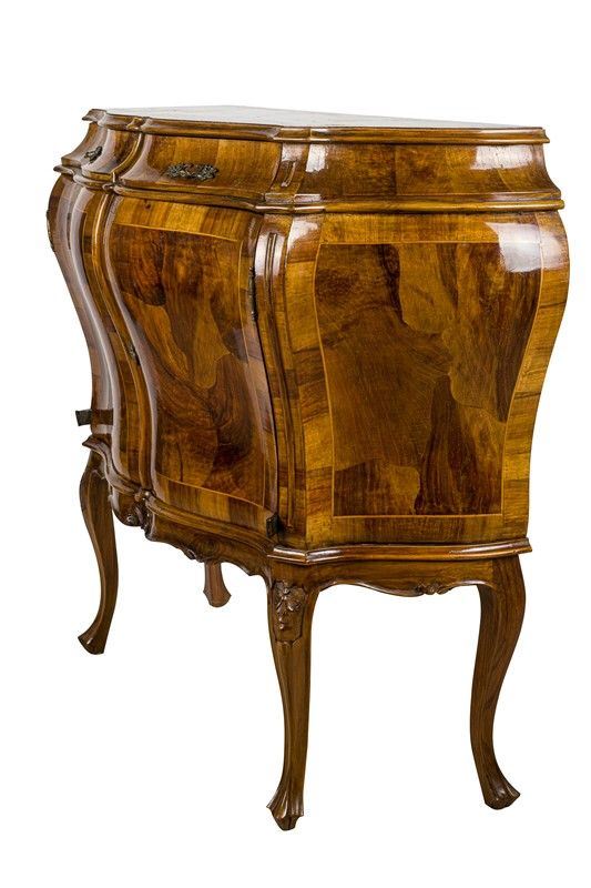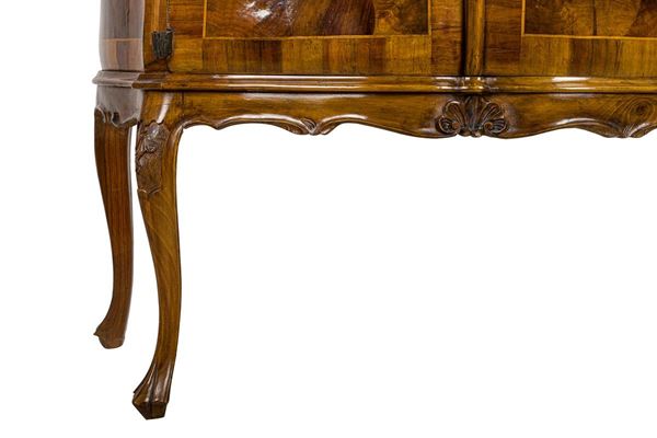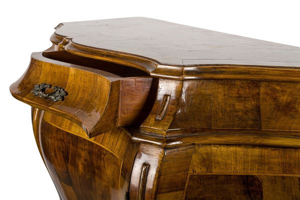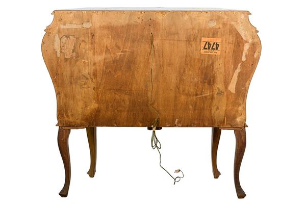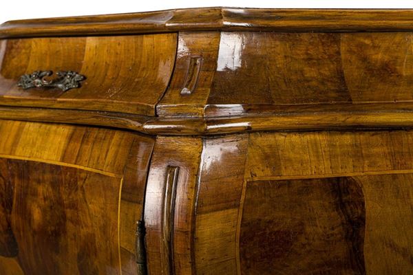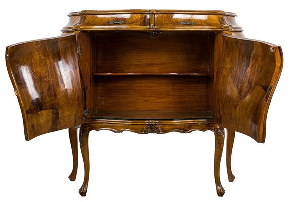 e due cassetti; impiallacciato in radica di noce, di forma bombata, con piedini a sciabola e applicazioni in bronzo.