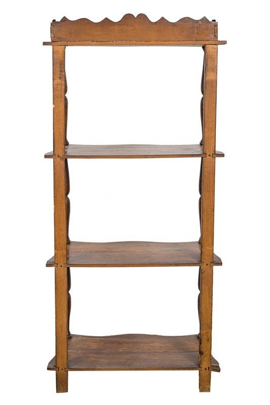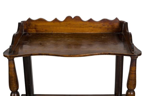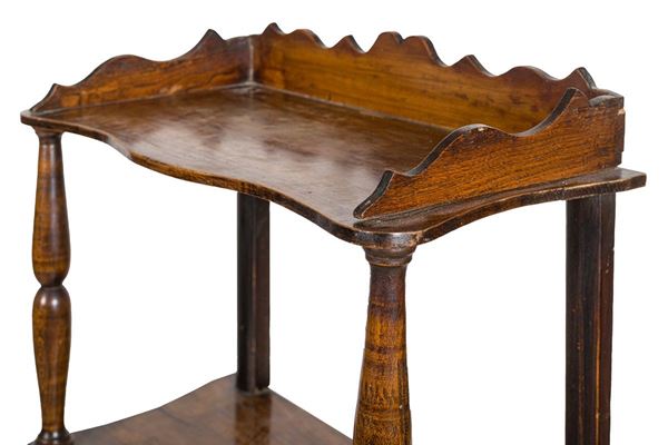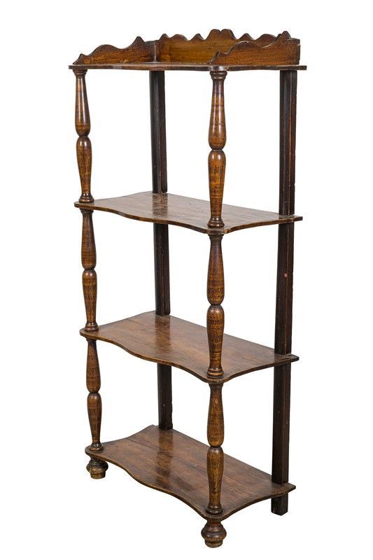 dal profilo mistilineo, a quattro ripiani, con colonnine e piedini torniti