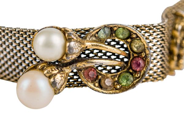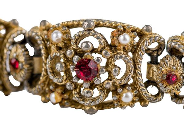 Composto da: bracciale a maglia snodata ad intreccio in metallo dorato, con smalti, avorio e navette di strass; bracciale in metallo tessuto con applicazione di elementi in metallo dorato, strass e perle di vetro; bracciale in metallo argentato composto da elementi snodati decorati con perle di vetro e strass rossi, orologio carica manuale in metallo dorato con il vetro del quadrante rotto ed abraso, da revisionare.