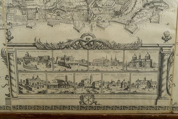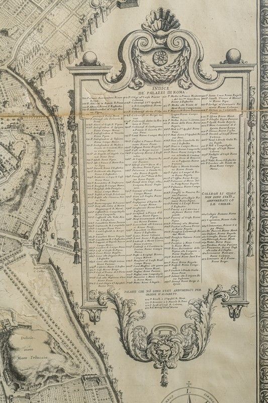 Titolo: "Nvova pianta et alzata della città di Roma con tvtte le strade, piazze et edificii de tempi, palazzi, giardini et altre fabbriche antiche e moderne come si trovano al presente nel pontificato di N.S. Papa Innocentio XI con le loro dichiarationi nomi et indice copiosissimo / disegniata et intagliata da Gio. Battista Falda da Valdvggio et date al pvblico da Gio. Giacomo de Rossi dalle sve stampe in Roma alla pace l'anno 1676 con privileggio del Som. Pont."