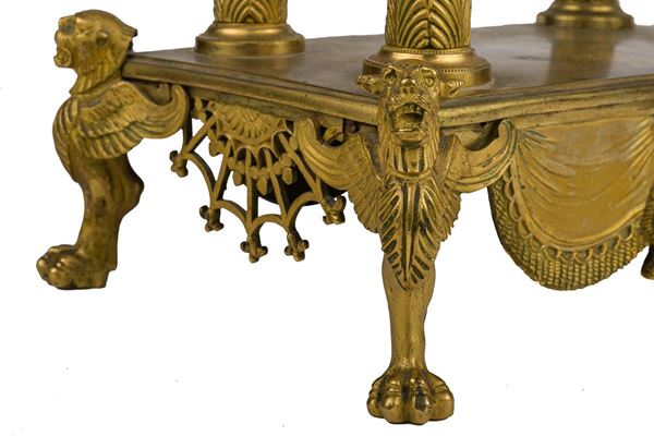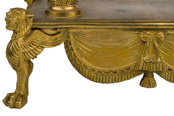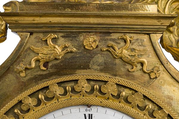 in bronzo dorato, con doppio foro di carica, base sorretta da grifoni e parte superiore sormontata da un pegaso; quadrante in smalto con numeri romani