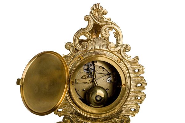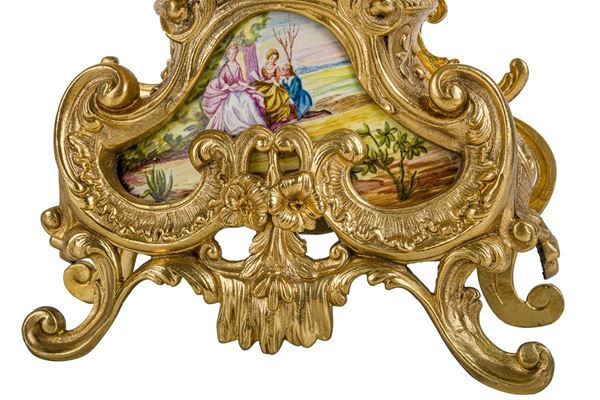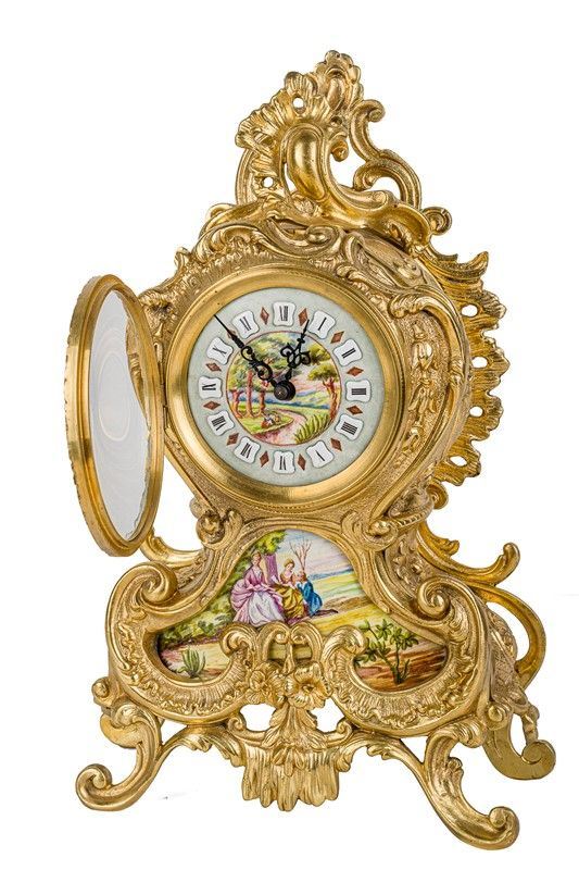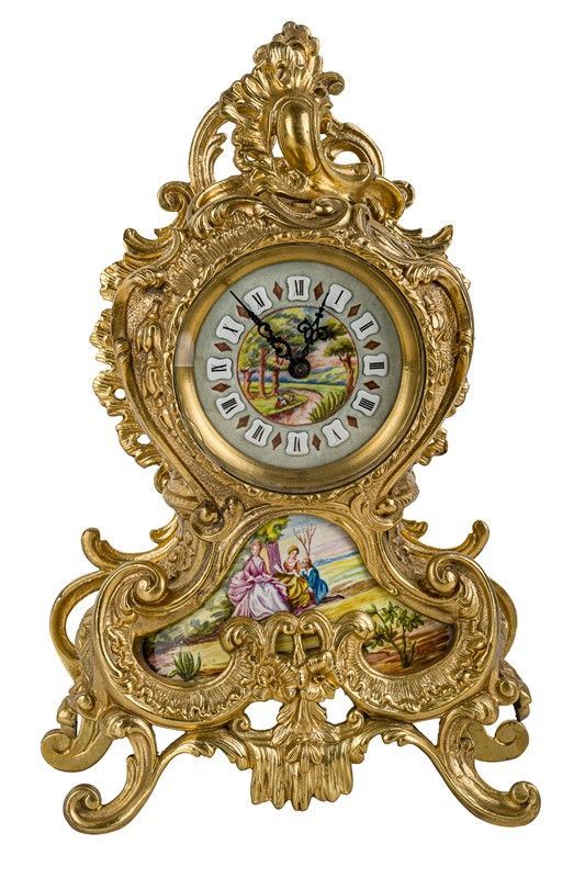 sagomato e cesellato a foglie, volute e rocailles; con quadrante in porcellana a numeri romani in smalto dipinto e raffigurante scena di galanteria sormontato da cimasa.