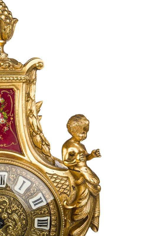 quadrante con numeri romani circondato da due puttini; dettagli dipinti a motivi floreali