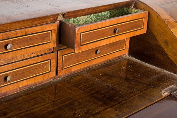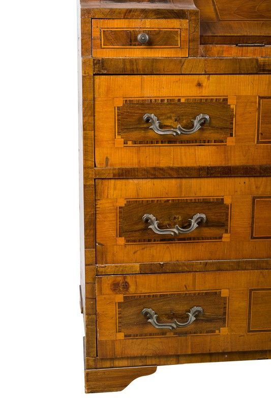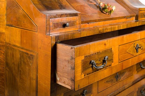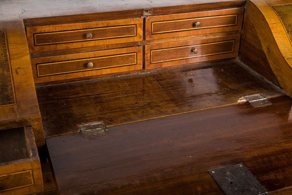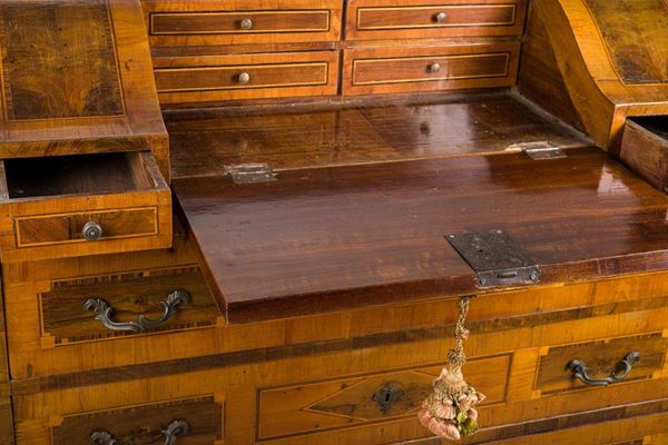 con intarsi in legni chiari; piano apribile con quattro cassettini; due cassettini esterni, e tre cassetti nel corpo centrale, applicazioni in bronzo