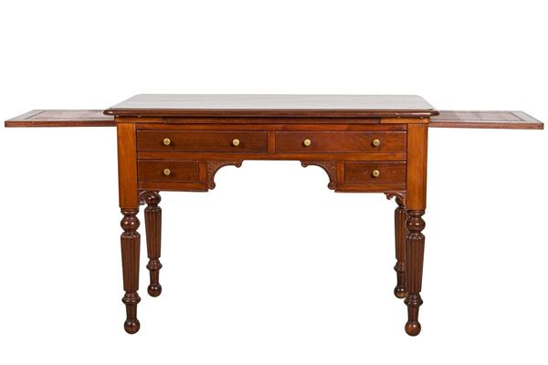 a quattro cassetti, con alette apribili foderate in pelle, gambe rastremate e scanalate con piedini tondi, lievissimi difetti