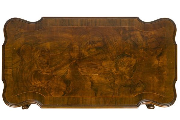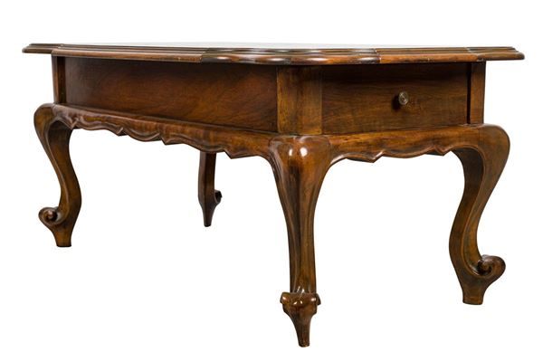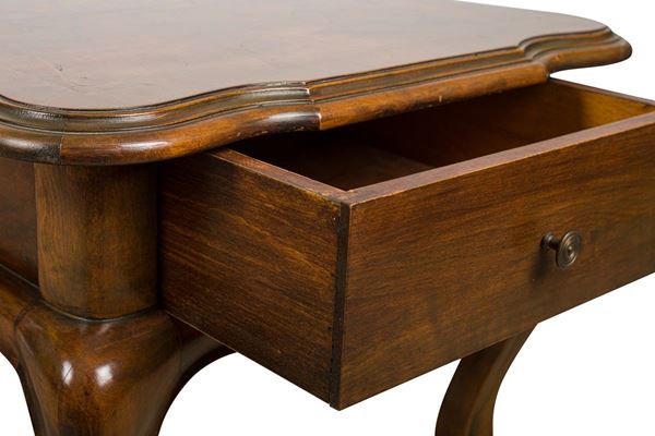in noce, dal profilo mistilineo, con due cassetti laterali e piedini arcuati.
