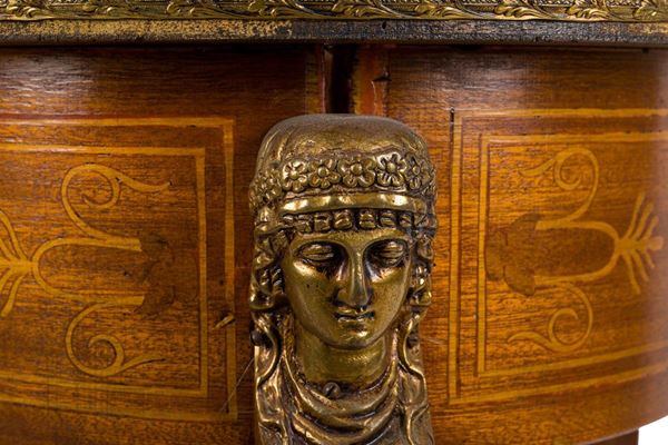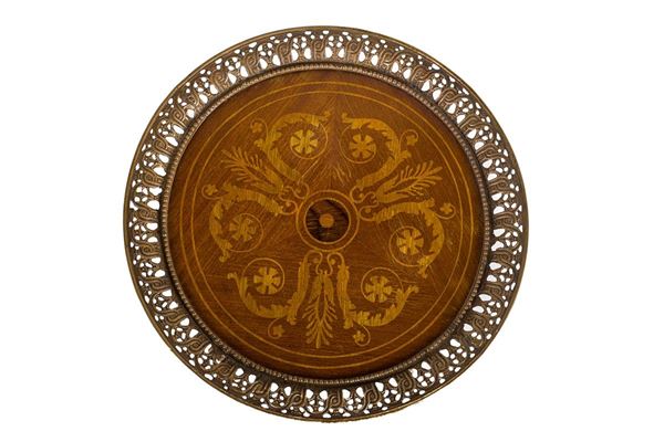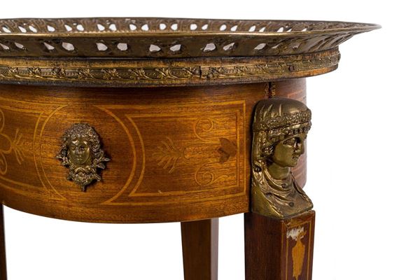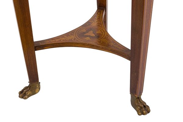 in legni chiari, con bordo perlinato e ringhiera traforata, con lesene; poggiante su tre piedi ferini