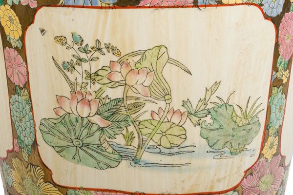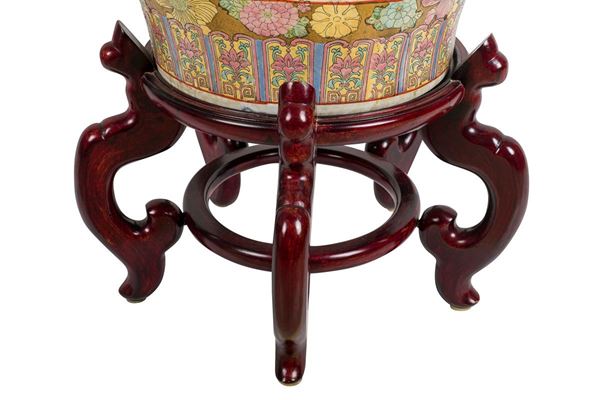 con decoro policromo e riserve con personaggi; completo di base in teak, gravi danni e rotture