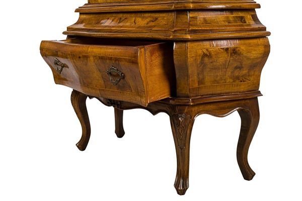 con un cassetto e uno sportello diviso in tre sezioni foderate in tessuto, cimasa intagliata, piedini a sciabola, applicazioni e boccachiavi in bronzo.