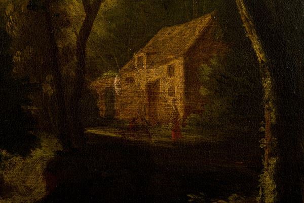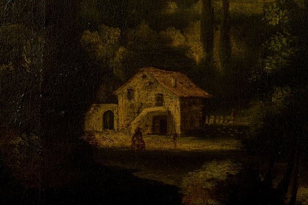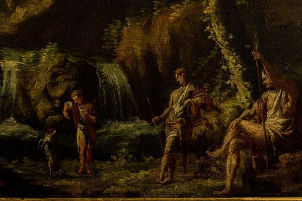 Paesaggio fluviale arcadico con corso d’acqua, cascatella e pastorelli, Italia, seconda metà del XVIII secolo