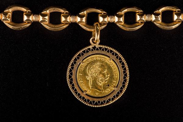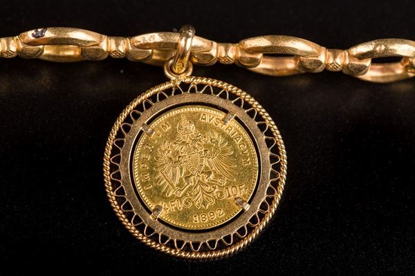 con ciondolo in oro 750, montante moneta da 10 franchi Francesco Giuseppe anno 1892, peso totale: gr. 21,4