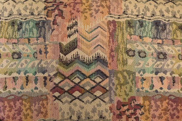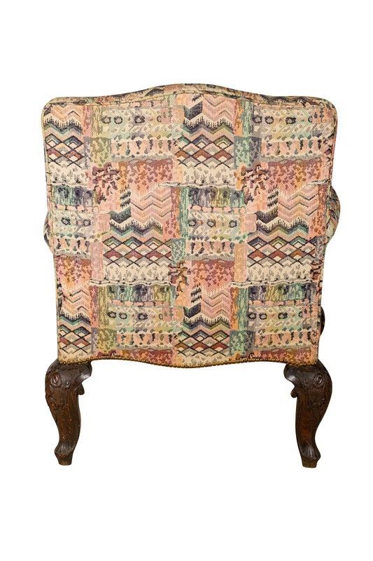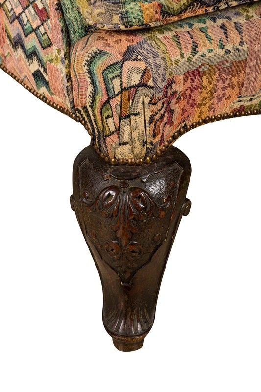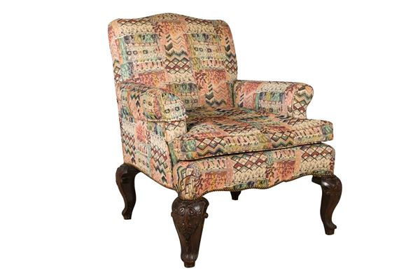 con tappezzeria in tessuto a motivi geometrici e piedi in legno intagliato