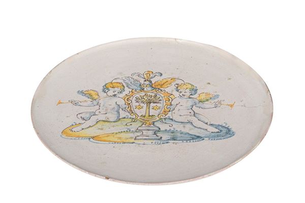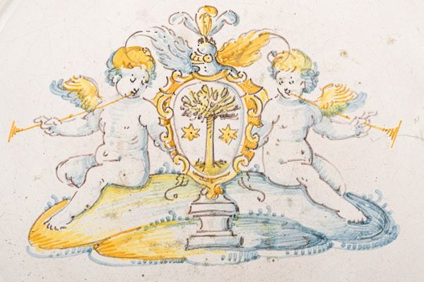 in maiolica dipinta raffigurante coppia di angeli musicanti e stemma gentilizio, difetti