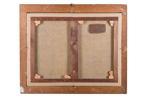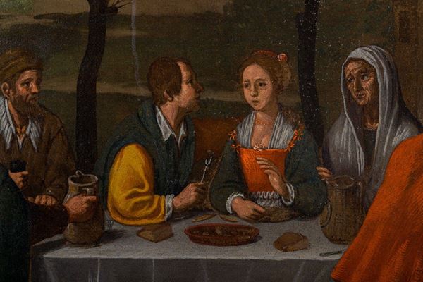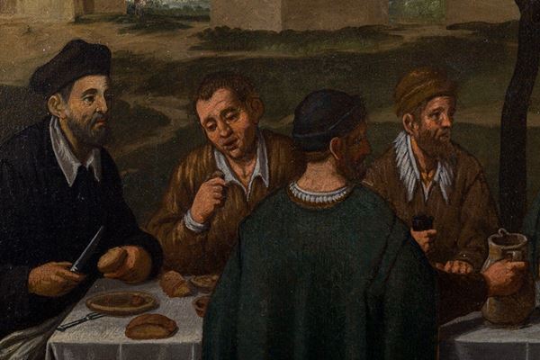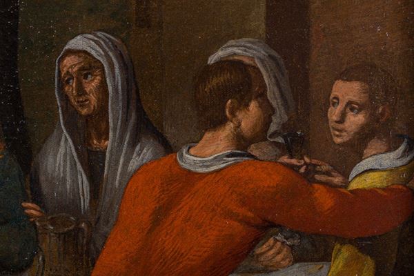 Restauri soprattutto nella parte inferiore del tavolo e nel terzo volto a sinistra. In cornice dorata.