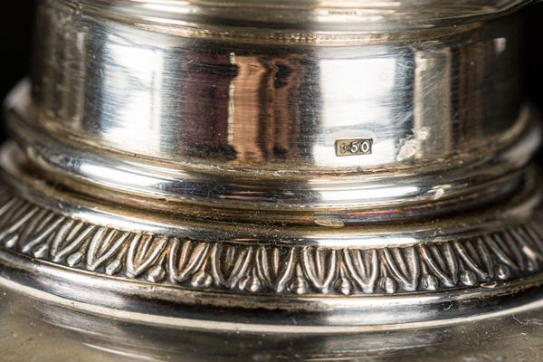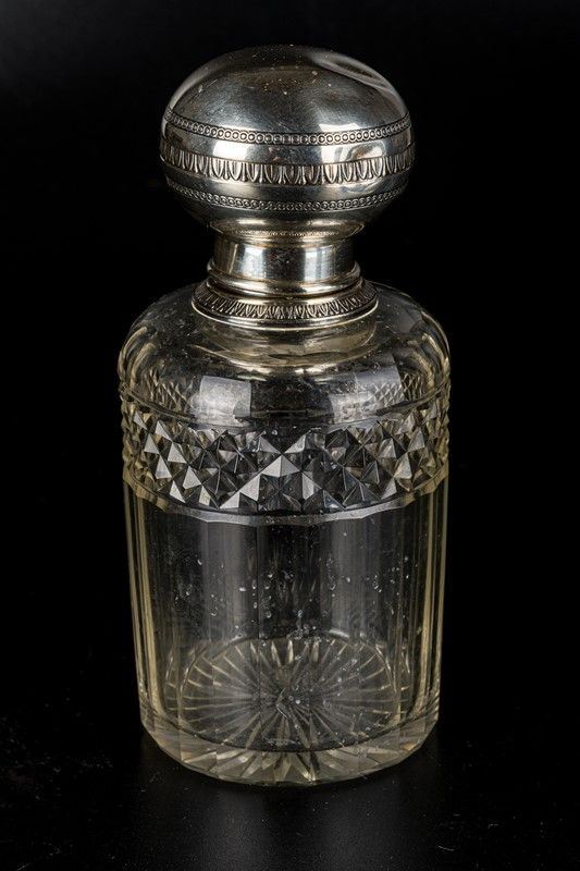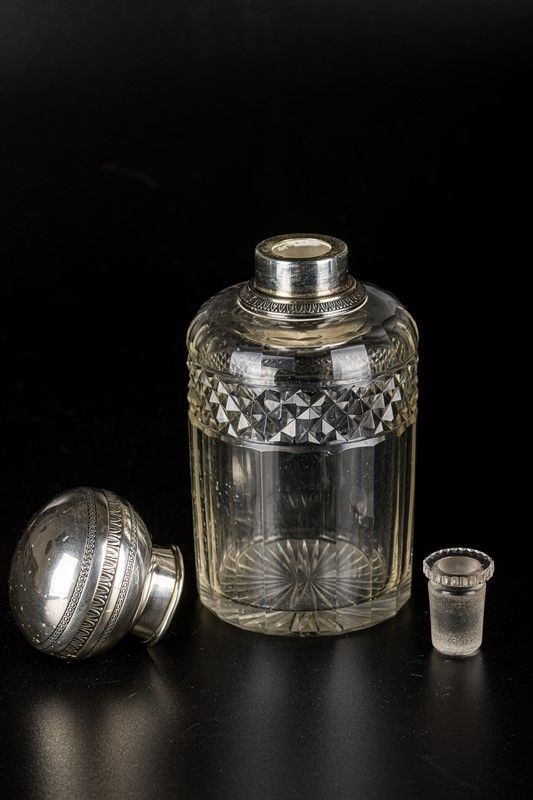 Coppia di bottiglie portaprofumo in argento 950 e cristallo controtagliato