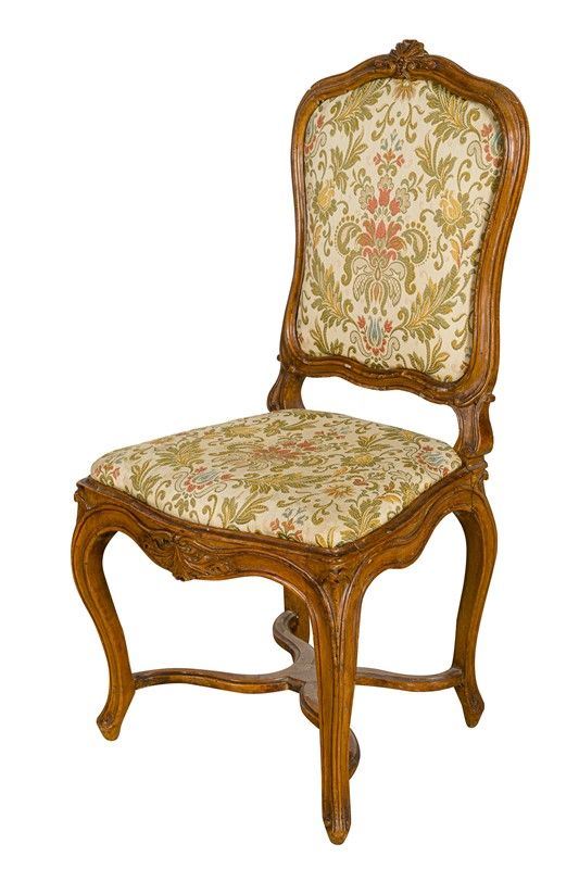 in legno di noce, tappezzeria in tessuto damascato a fiori, gambe arcuate, difetti, rotture