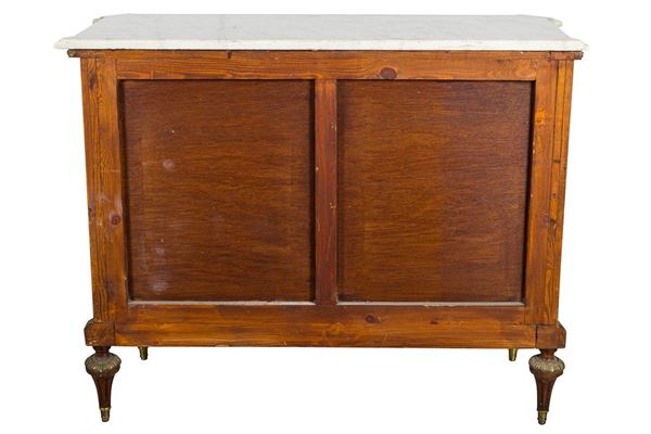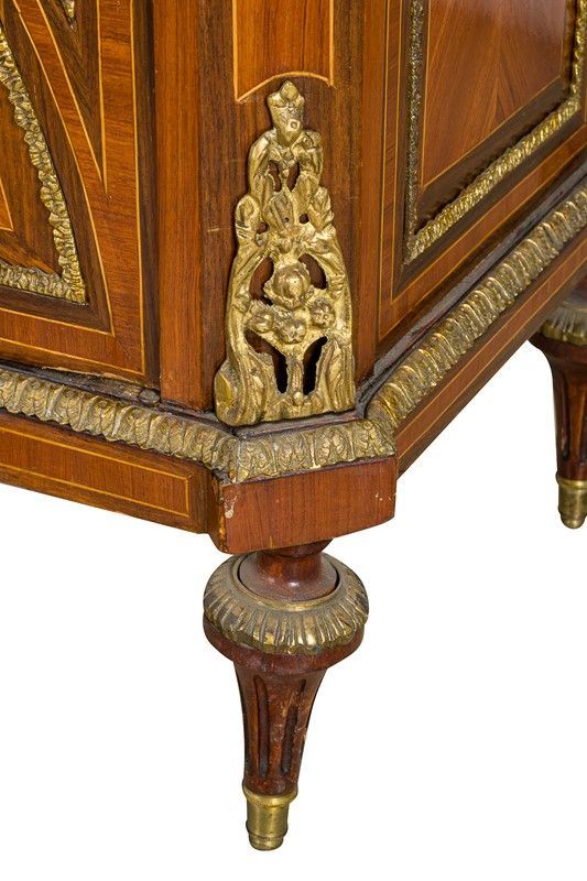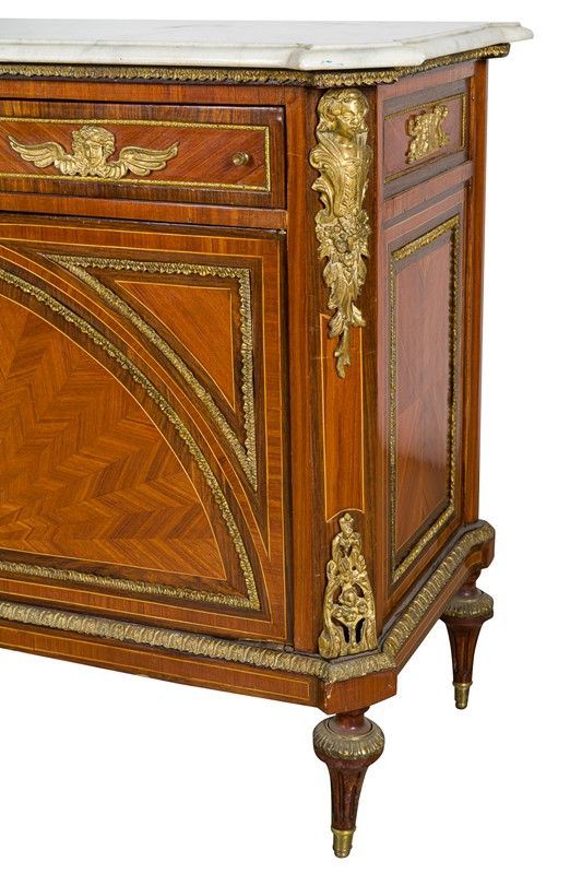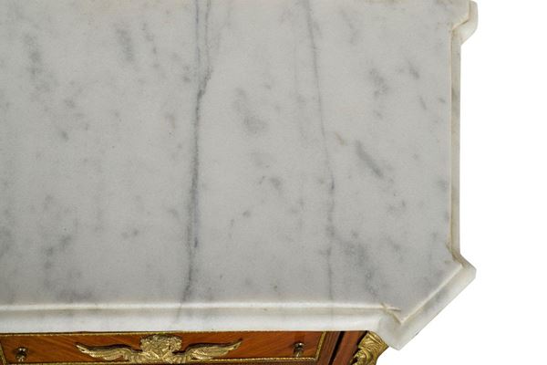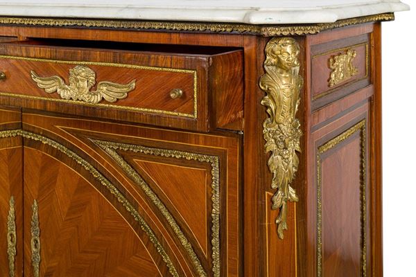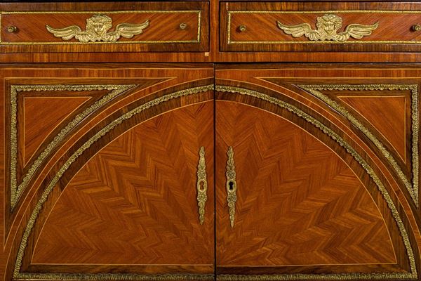 impiallacciata in legno di rosa e palissandro, a due sportelli e due cassetti, con guarnizioni in bronzo dorato e teste di putti, piano con marmo bianco di Carrara (piccola scheggiatura), piedi torniti, piccoli difetti