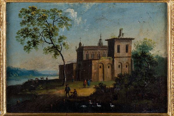 Coppia di paesaggi con viandanti e architetture