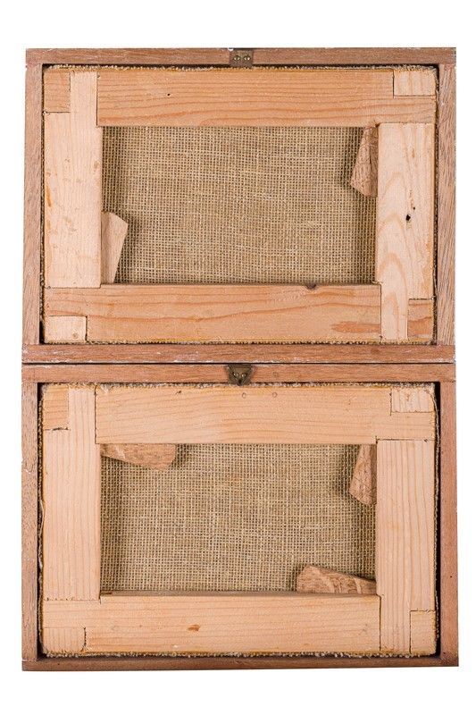 La superficie pittorica presenta cadute di colore ai bordi e ampia craquelure. In cornici dorate