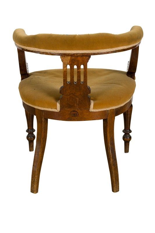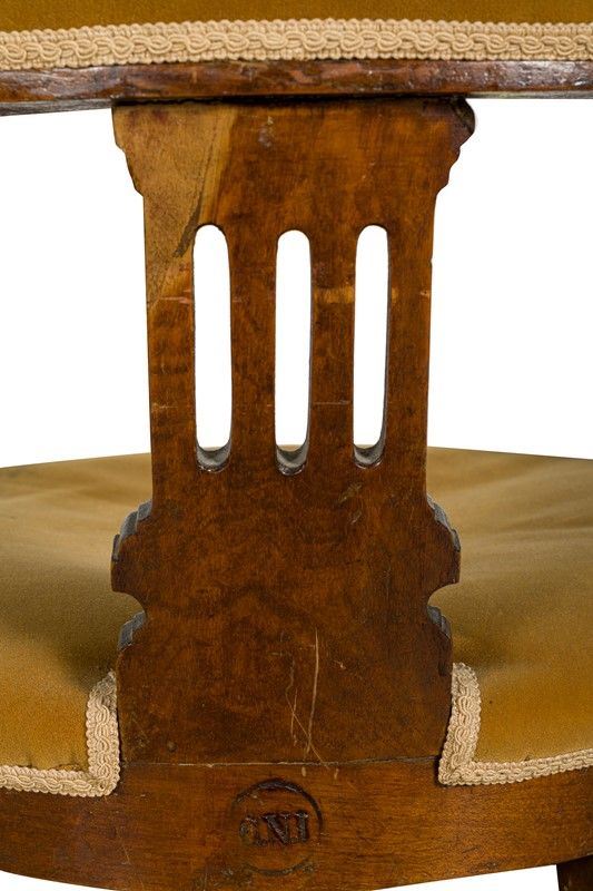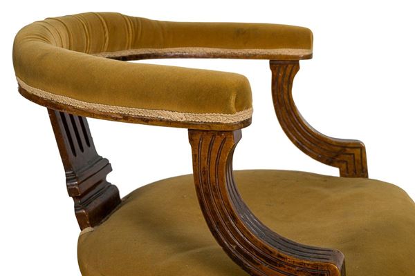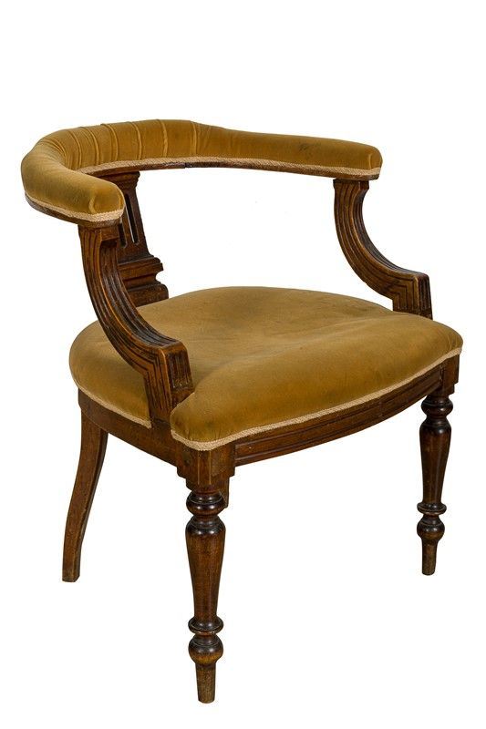 in noce, braccioli semicircolari scanalati, con tappezzeria in velluto macchiata, gambe tornite, piccoli difetti