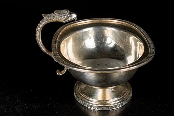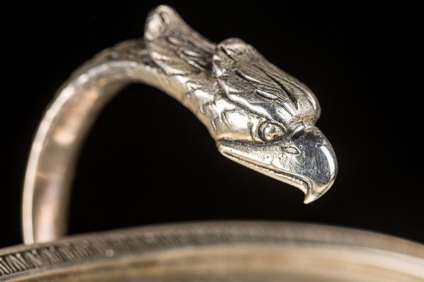 con bordo a palmette e testa di volatile, peso: gr. 170