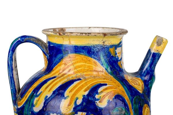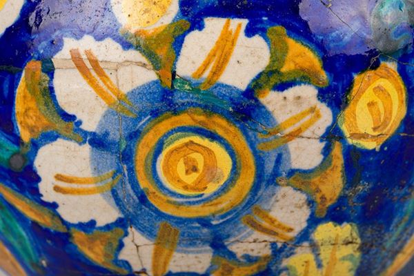 in maiolica policroma, decoro a motivi floreali, rotture e restauri