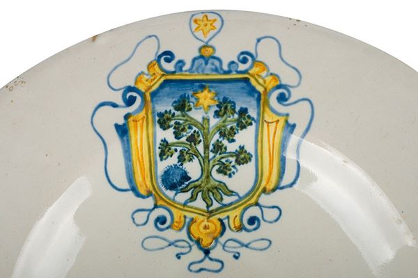 in maiolica, con stemma gentilizio, scheggiature e rotture