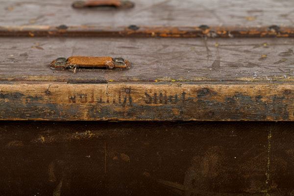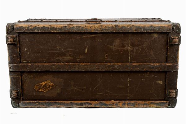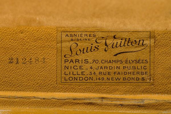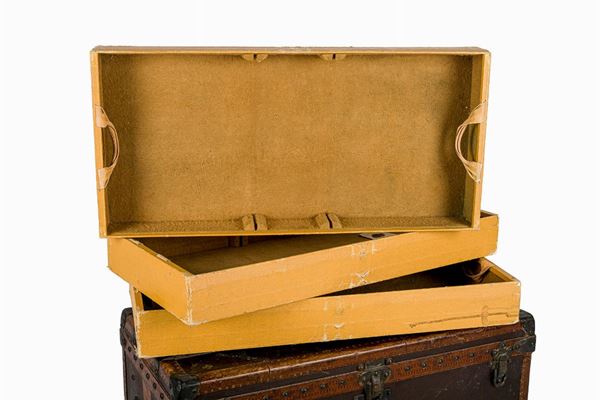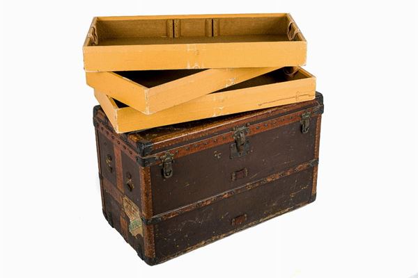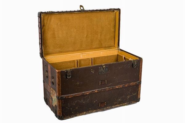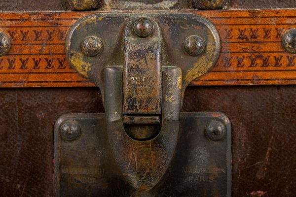 pelle, acciaio e tela, codice n. 042867. Come confermato dal Service Patrimoine Louis Vuitton, tramite e-mail, il baule è stato acquistato dalla casa madre nel 1916. Monogrammato nelle parti in pelle più chiara; interno originale; sul lato presenti le etichette relative ai viaggi ferroviari