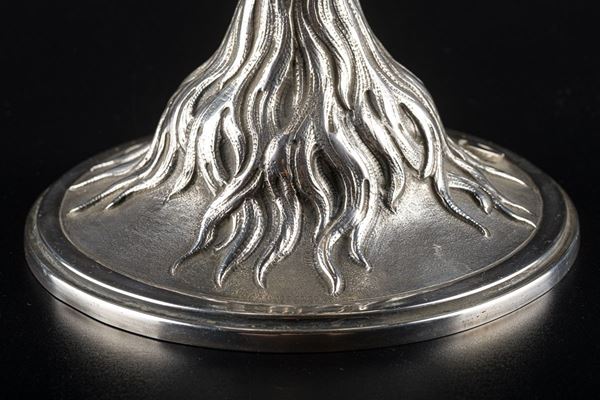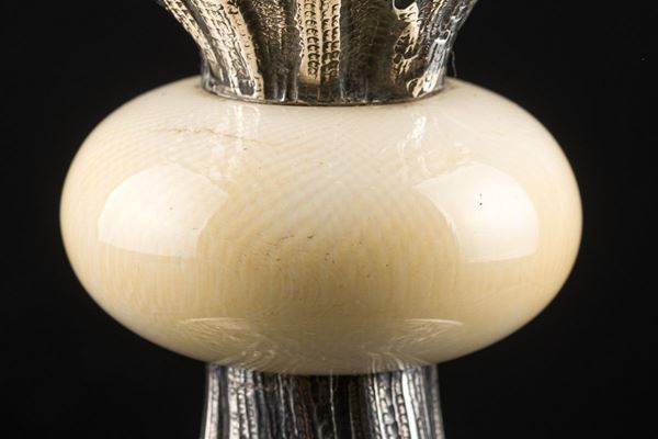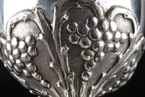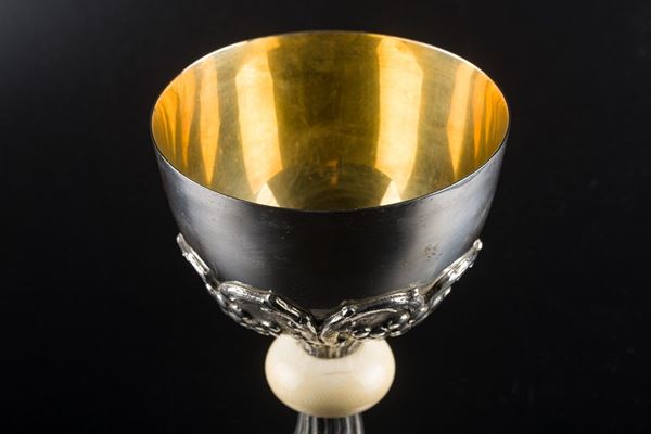 in argento, con rocchetto in avorio e lavorazione sul piede con ramificazioni, decori a grappoli d'uva sulla coppa, gr. lordi 594