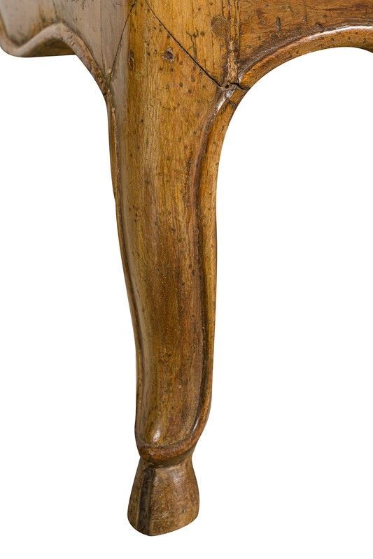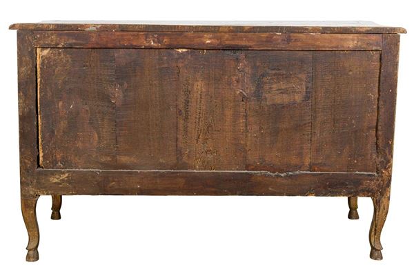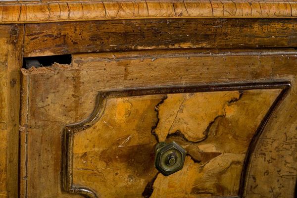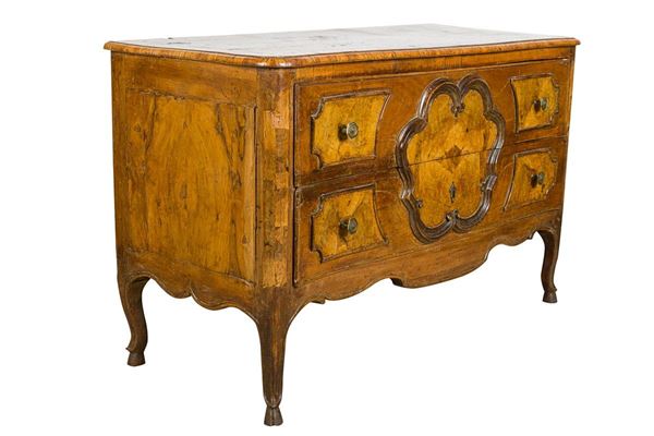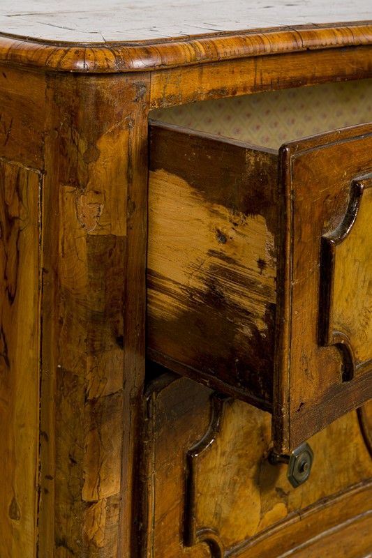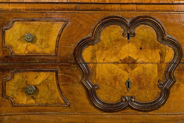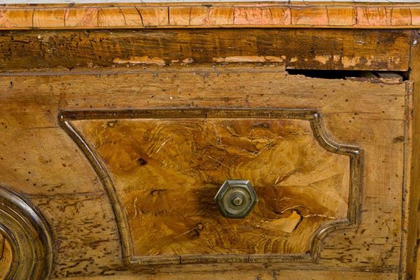 dal profilo mistilineo, lastronati in noce e radica di noce, con figure geometriche scolpite, a due cassetti, mancanze e difetti