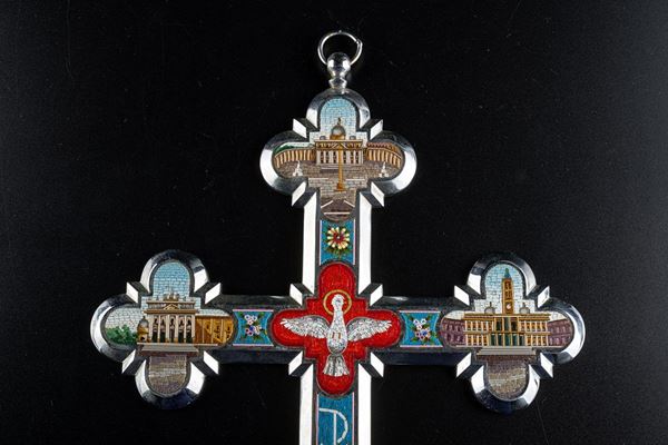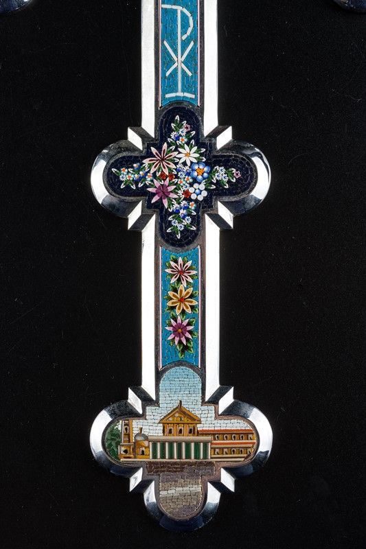 con micromosaici raffiguranti chiese, simboli religiosi e fiori