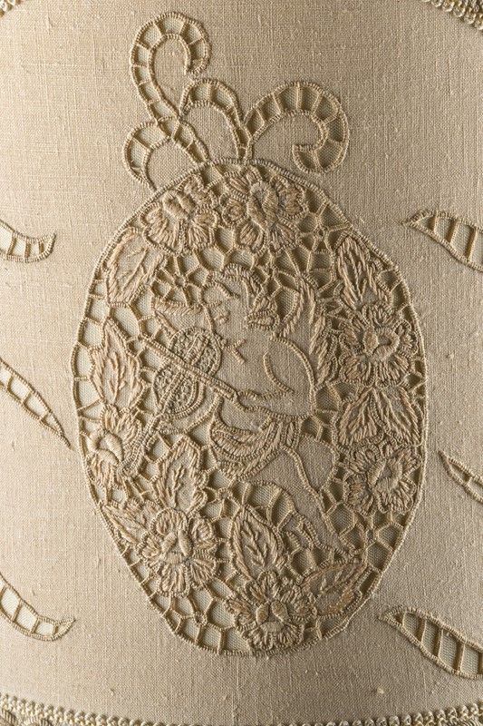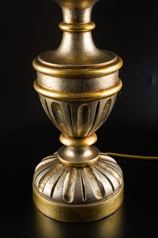 con paralume in lino ricamato e base in legno dorato