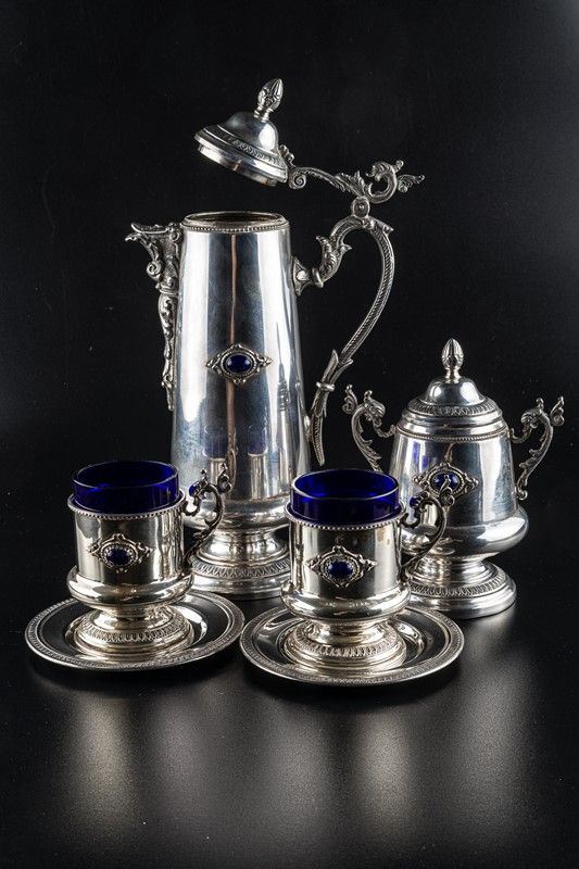 composto da caffettiera, zuccheriera e sei tazzine, con parte interna in vetro e 6 piattini.