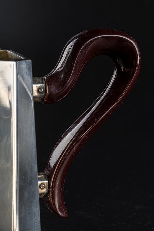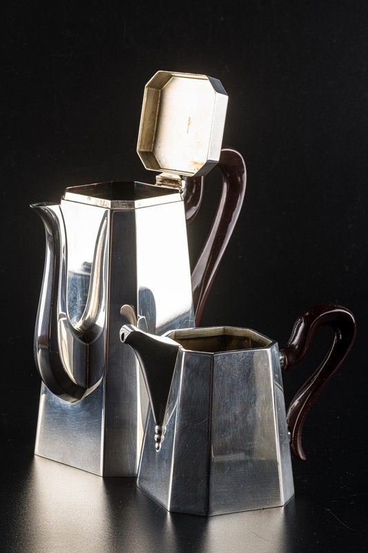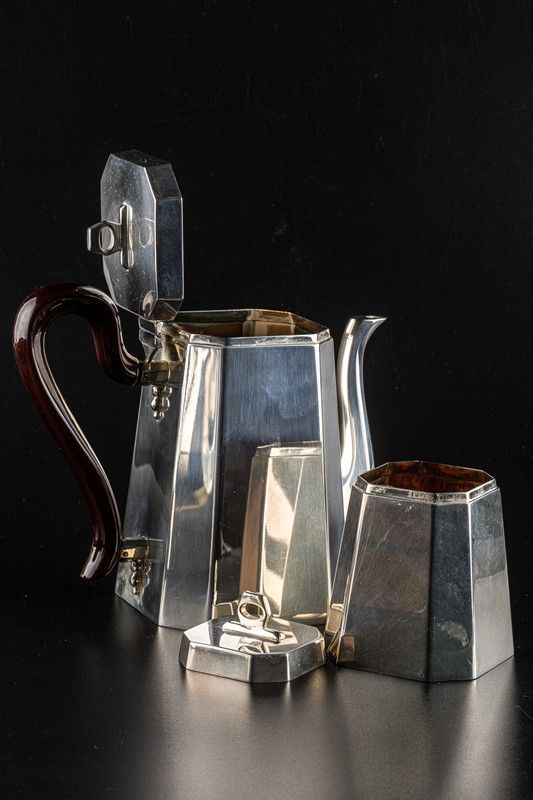 in stile Art Deco, argentiere Zaramella Padova, Anni '50, con manici di legno, composto da zuccheriera, caffettiera, lattiera e teiera, gr. lordi 2178