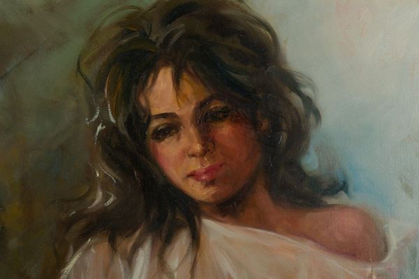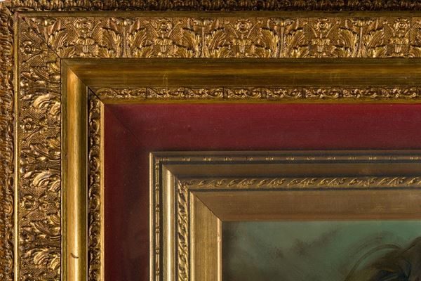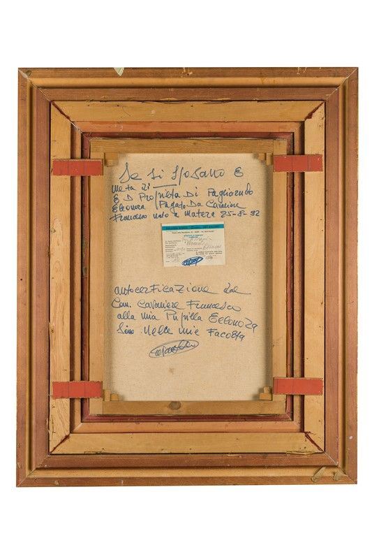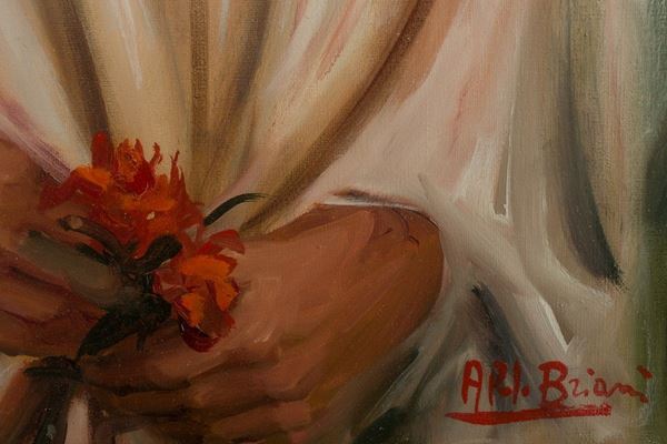 figura di fanciulla che stringe tra le mani un mazzo di fiori, firmato, con doppia cornice, dedica e certificato di garanzia
