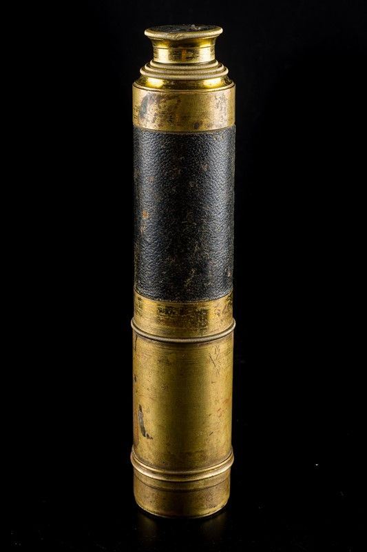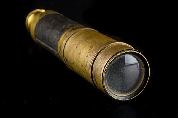 con tubo in ottone estendibile, impugnatura rivestita in cuoio marrone, lenti originali