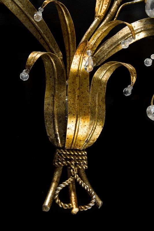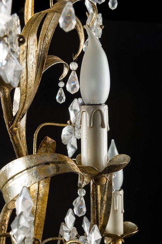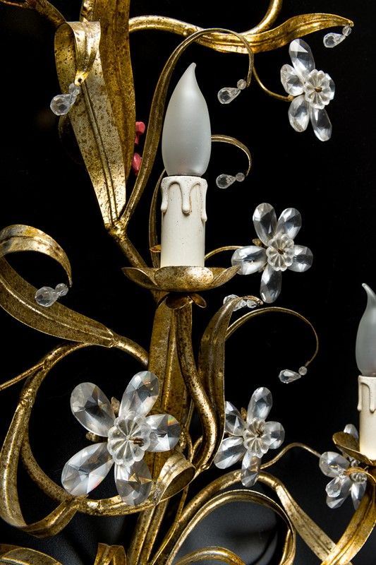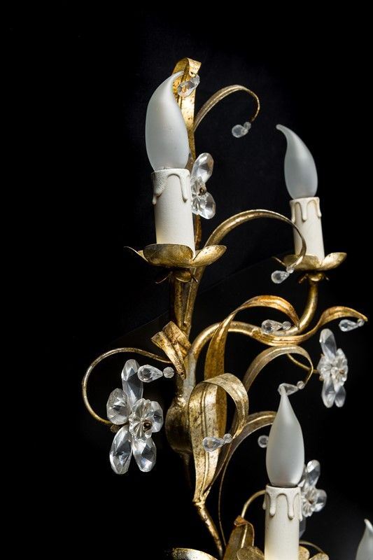 a cinque luci, in metallo dorato con pendenti e decorazioni a fiori in vetro