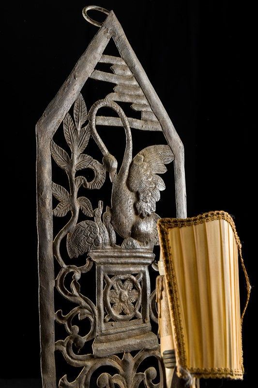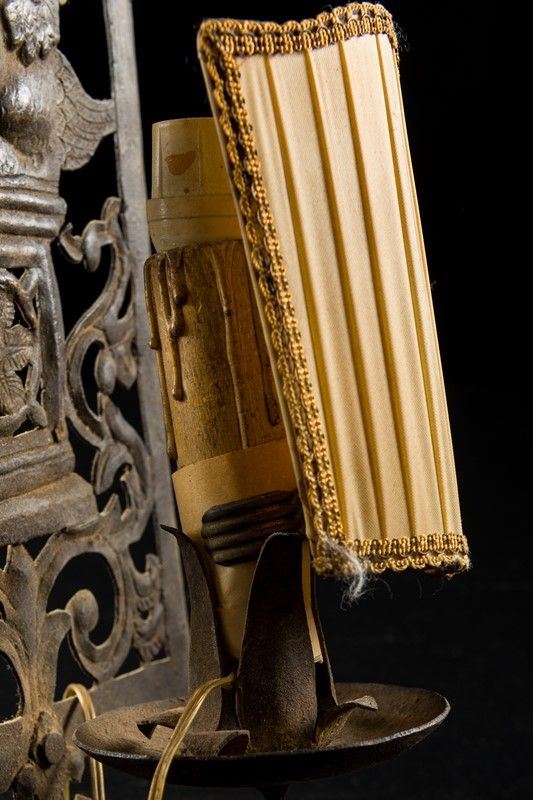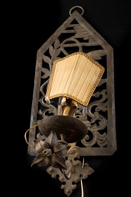 in bronzo traforato con cigno e fiore scolpito, lume singolo con paralume in stoffa, difetti