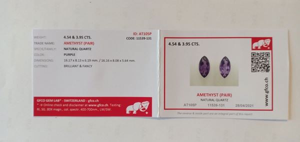 provenienza: Brasile - 4.54 e 3.95 carati - colore: viola - chiarezza: VS - non termotrattate - non trattate - taglio: brillante & fancy - forma: marquise - dimensioni: 16.17 x 8.13 x 6.19 mm / 16.16 x 8.08 x 5.64 mm - con certificato GFCO (Laboratorio svizzero) AT105P