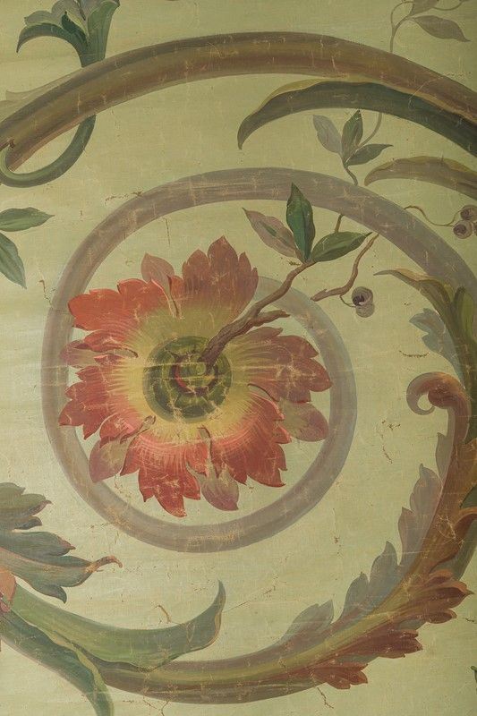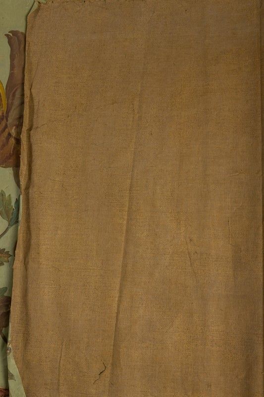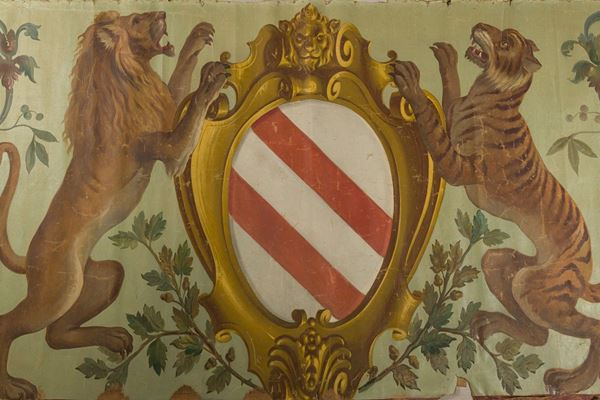 la tela mostra al centro uno stemma nobiliare a righe bianche e rosse, entro una cornice dorata con alla sommità una testa di leone, sorretto da un leone e una tigre come simbolo di forza e potenza della casata. Attorno una ricca decorazione floreale a girali. Tagli della tela e cadute di colore