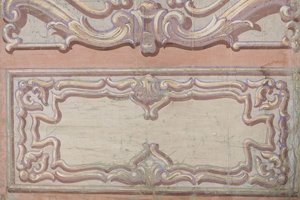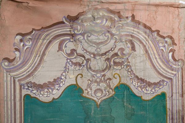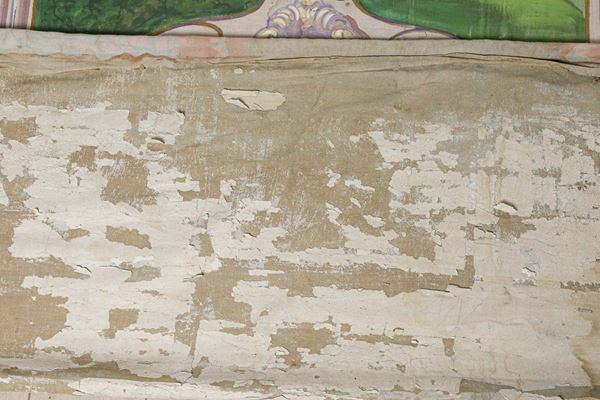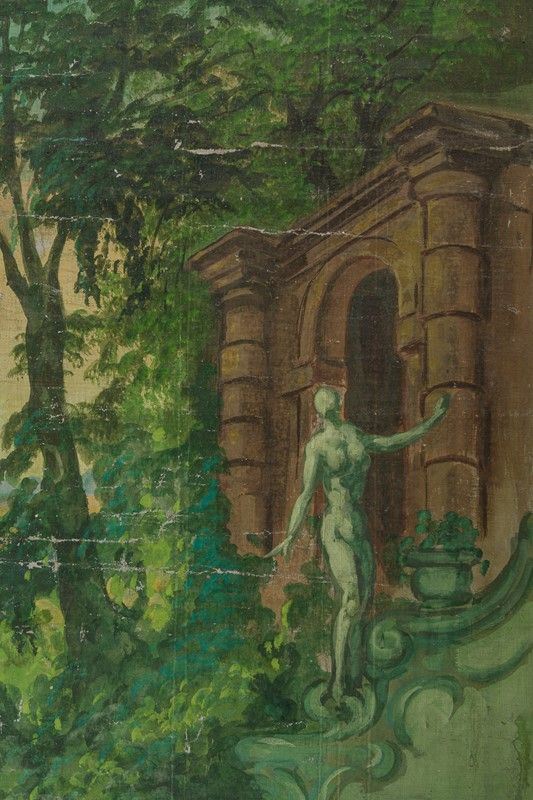 al centro una veduta campestre con un antico rudere e una statua di figura femminile, racchiusa entro decorazioni stilizzate, con due barre di ferro, gravi danni con macchie di umidità e distaccamenti della carta sul verso