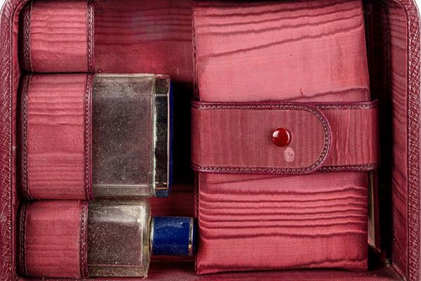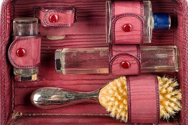 di cui: 5 bottiglie, 1 spazzola e uno specchio, in custodia, totale pz. 7, mancanze
